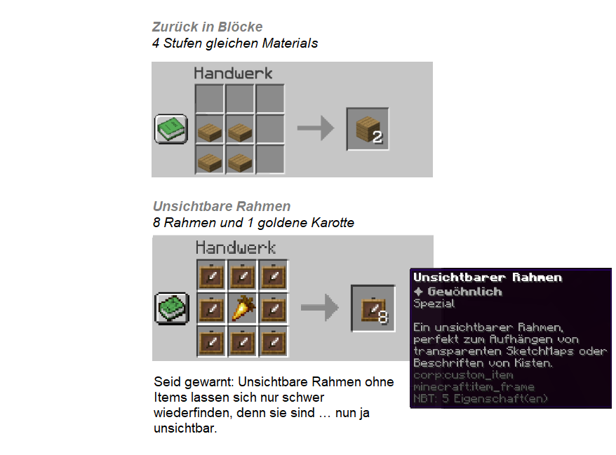 Sobald Ihr die Rezepte angewandt habt, werden sie in euer Rezeptebuch im Game übertragen. Weiter habt ihr die Möglichkeit, euch alle Rezepte am Spawn freizuschalten, darunter dann auch die Custem-Rezepte von Oma.